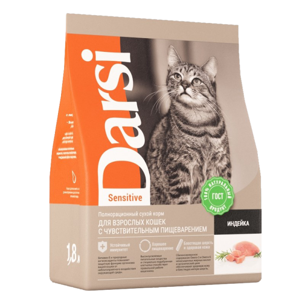Darsi Sensitive (Индейка) - это полнорационный сухой корм для взрослых кошек с чувствительным пищеварением.